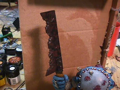 Next was to stipple the blade using charred brown. Stippling is done by cutting a VERY old brush down to about a quarter of an inch of bristles. You then get paint and wipe it off (like overbrushing) and dot the surface with the color to give it a random pattern. This can also work well for painting camo patterns as well as rust.