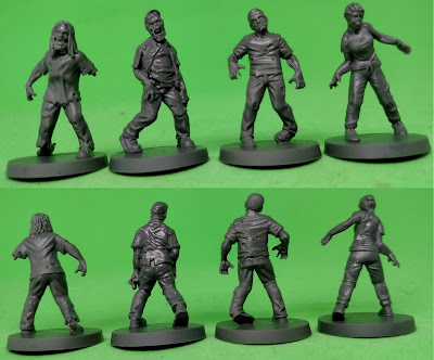 There are twelve walkers in the base set. These are even better sculpts than the survivors - each is full of personality. One is obviously a waitress with an apron on - and I like the woman in the pantsuit (what would it take to make that Hillary Clinton?) It is also interesting to me that half of the walkers are actually women - equal brains for equal shambling I say.