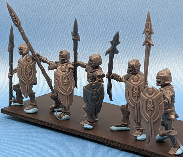 Were I to make more, I would glue the left arms to the back of the shields, buy wait to attach them until after I had painted them, as it is ALWAYS difficult to get the inside of the shield.  Plus I could have based them in the blue instead of the gold that I did for the skeleton bodies (as the armor makes up the majority of the body)  (there is actually much less exposed bone than I would have preferred for skeletons).